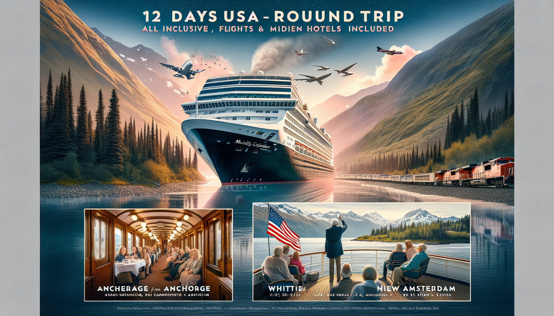 Begeben Sie sich auf eine unvergessliche **12-tägige USA-Rundreise** durch das faszinierende Alaska. Diese Reise von **Anchorage bis Whittier** bietet Ihnen die Möglichkeit, die spektakulärsten Landschaften der Welt zu erleben. Von der rauen Wildnis des Denali Nationalparks bis hin zu einer luxuriösen Kreuzfahrt mit der **Nieuw Amsterdam** – diese Tour ist ein Muss für jeden Abenteuerliebhaber.